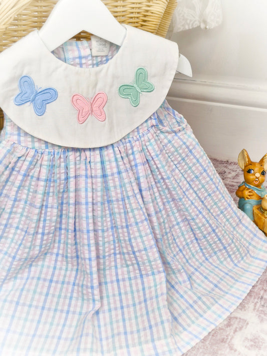 12-18 months. Pastel seersucker sleeveless vintage dress with white bib and butterflies