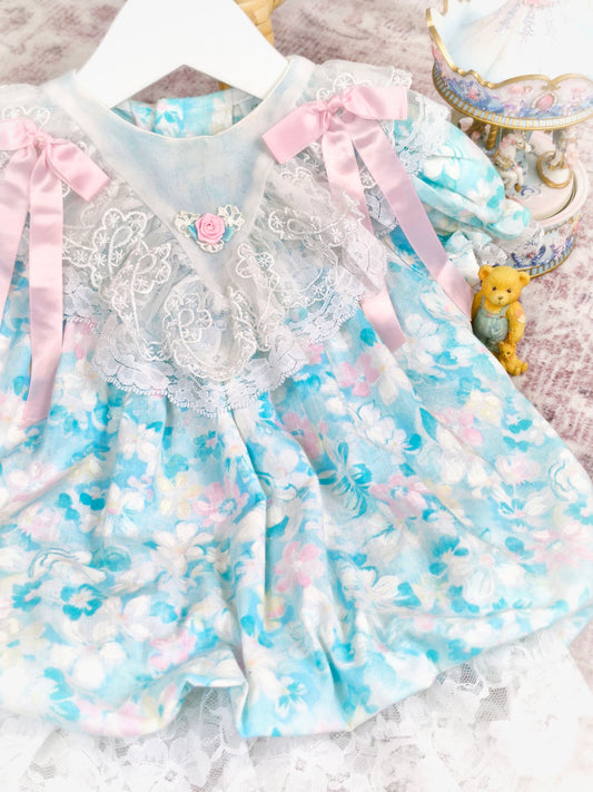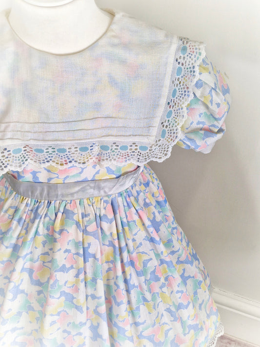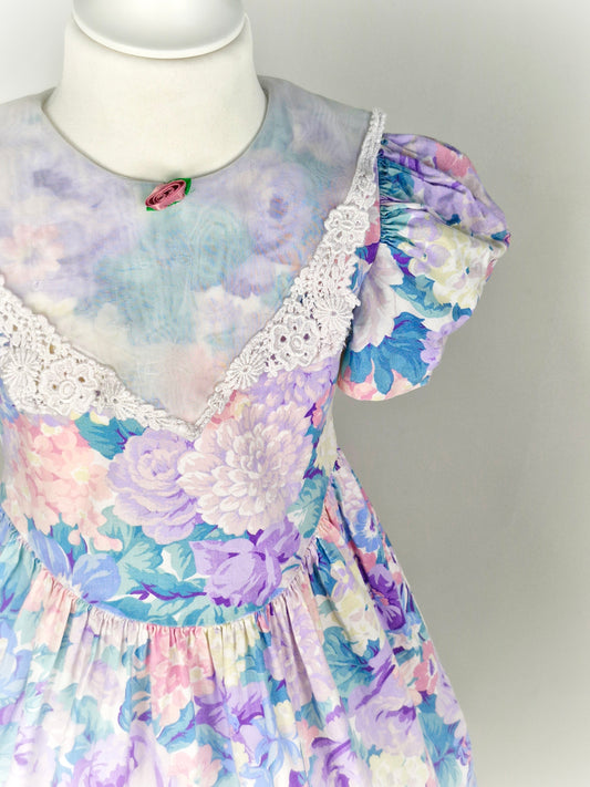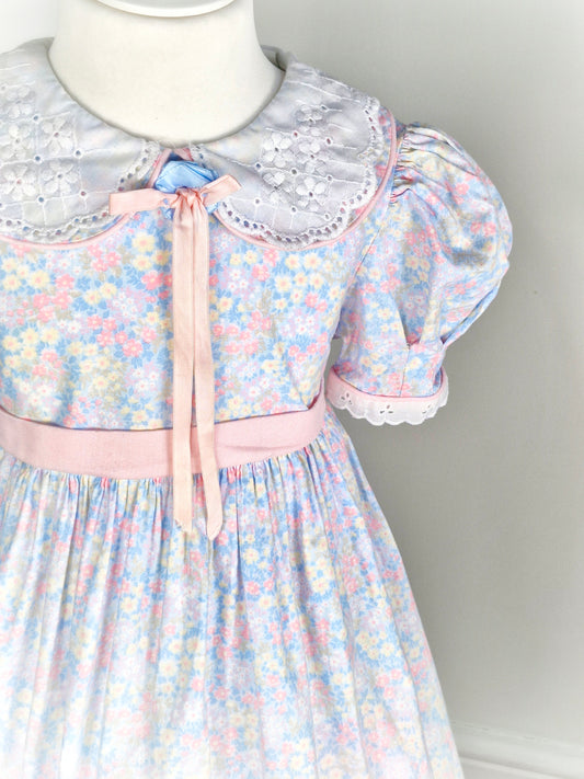 5-6 years. Pastel floral vintage Bryan with puff sleeves, pink waist tie and ribbon bow.