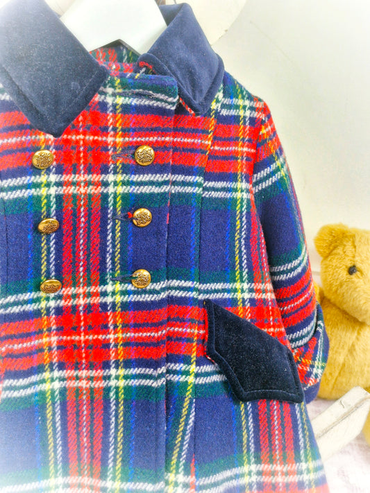 18-24 months. Navy, red and white tartan vintage coat with gold buttons
