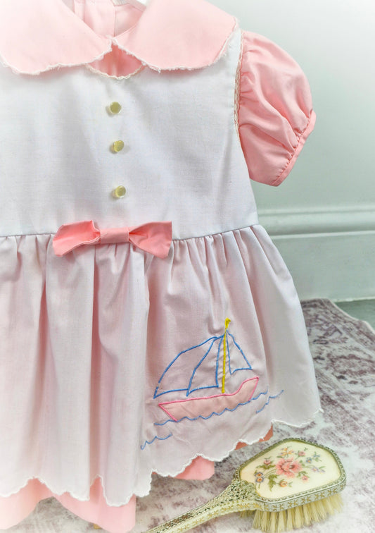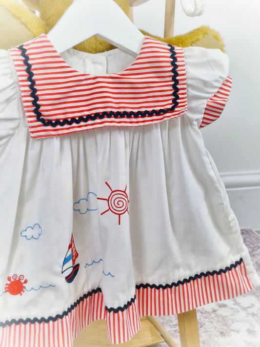 9-12 months. Vintage dress embroidered with boat and matching headband