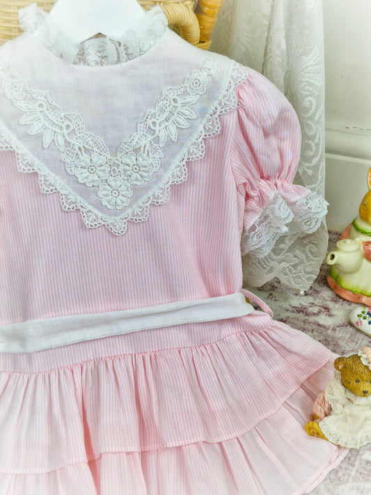 2 years. Pink and white striped vintage Bryan with drop waist, lace sleeves and white bib with lace trim