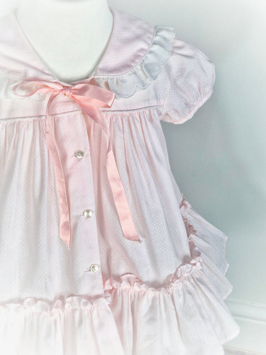 18-24 months. Light pink vintage Bryan with white polka dots and pink satin ribbon