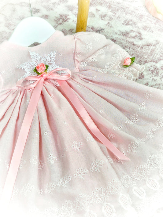 9 months. Pink vintage dress with delicate floral appliques and a ribbon bow